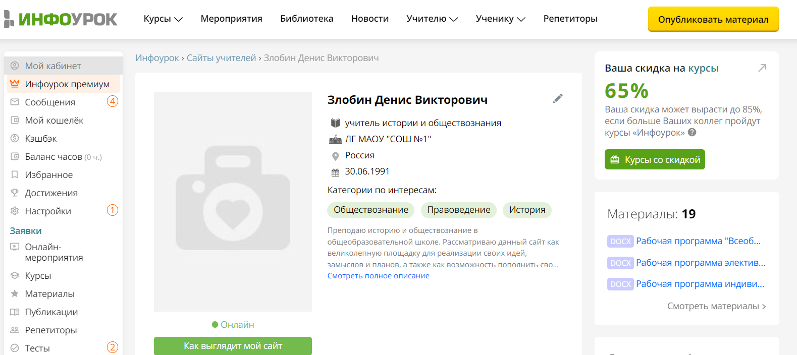 Инфоурок. Личный кабинет.